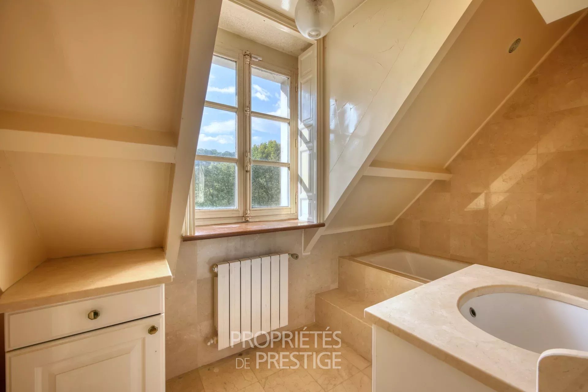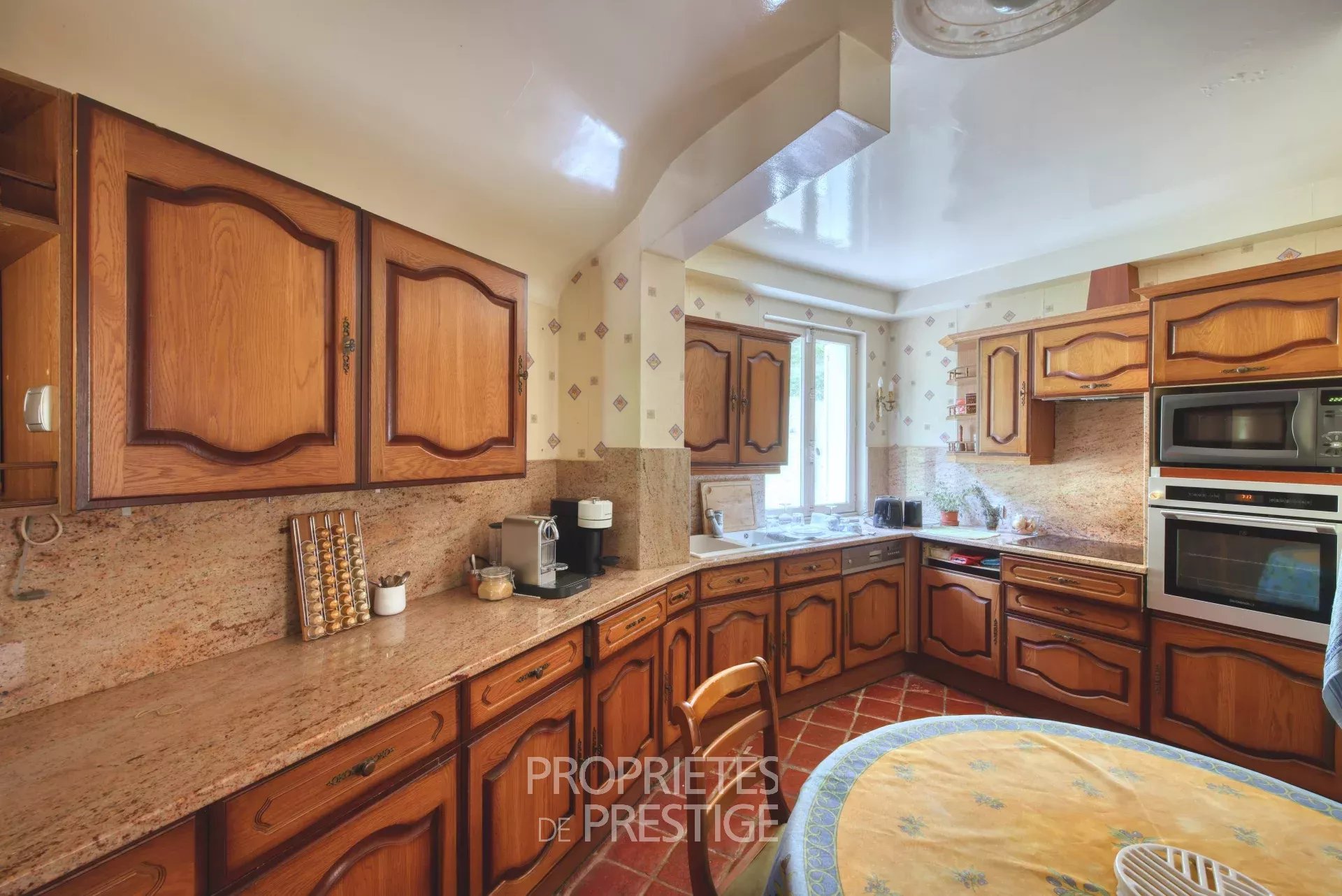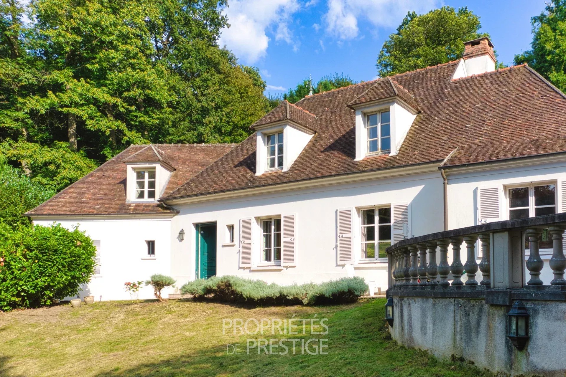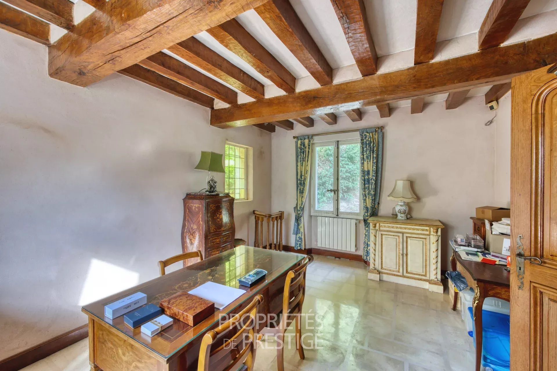 Située à 500 m du centre-village de Buc, cette propriété étendue sur un hectare en lisière de forêt domaniale de Versailles, vous offre un cadre exceptionnel pour la région. La demeure style Ile de France compte un total de 8 pièces sur 287 m² habitables (320m² utiles), dont une vaste réception de 80 m² avec une cheminée ancienne et une double exposition ouvrant sur le parc et la forêt, une cuisine indépendante, un grand bureau... A l’étage, suite parentale avec salle de bain et dressing, trois chambres, deux salles de bain… Le sous-sol est aménagé avec une salle de billard, une cave à vin, des espaces de stockage, une salle forte… Côté jardin, la maison est entourée de terrasses pour profiter de toutes les expositions. La piscine à rénover est exposée plein sud, avec vue dominante sur la vallée. Le parc s’étend jusqu’à la limite de la forêt domaniale bordée d’une enceinte en meulière. Un court de tennis à rénover est situé sur la partie supérieure du parc. Un environnement naturel unique à seulement 13 km des portes de Paris. Golf de La Boulie à proximité. Lycée Franco Allemand à 1,3 km. Possibilités de division et de constructions supplémentaires (environ 4000m² en zone UH du PLU).