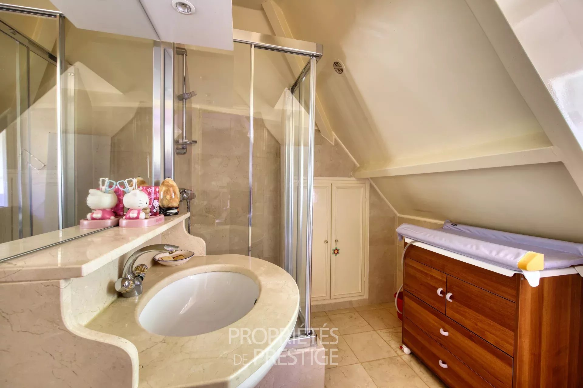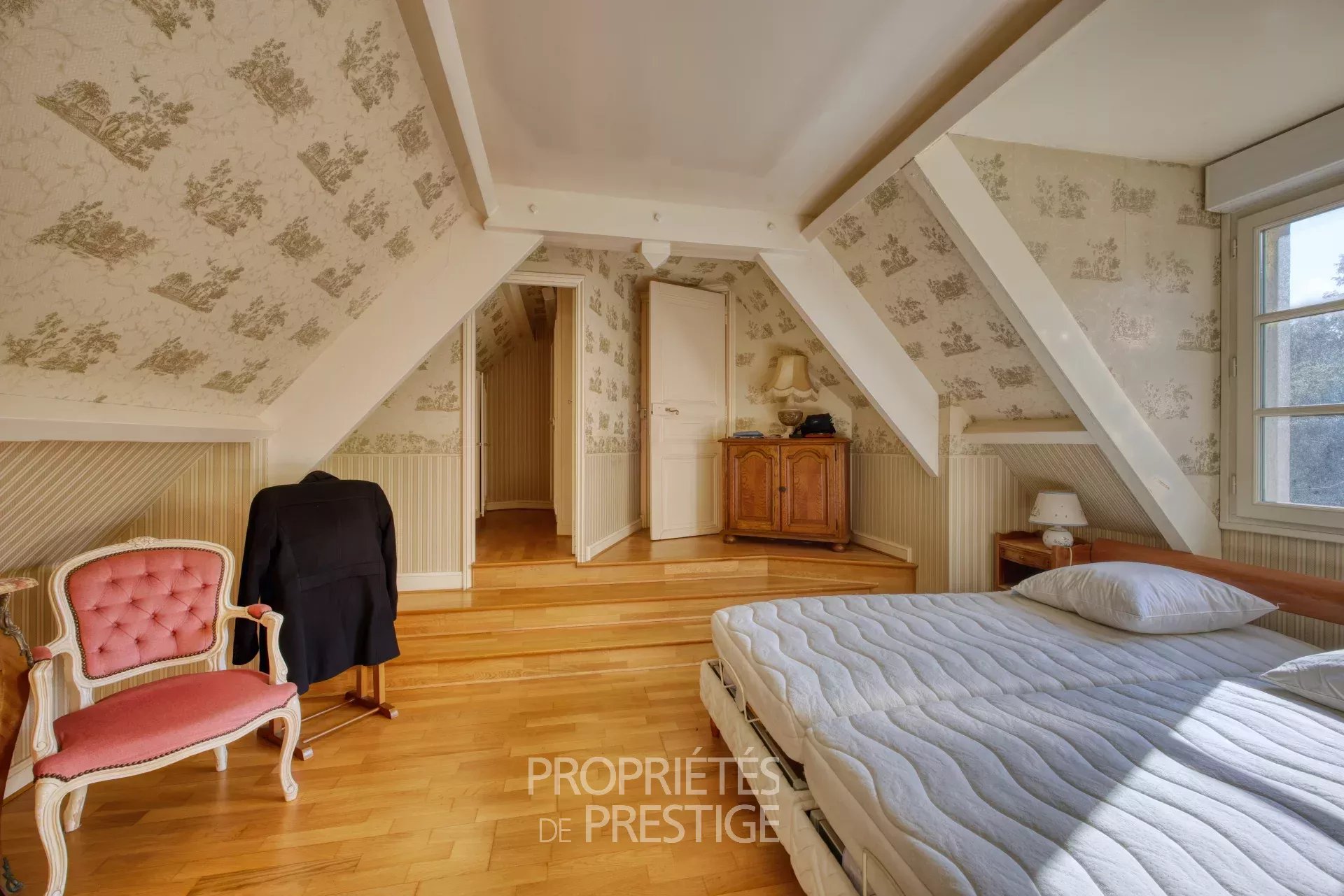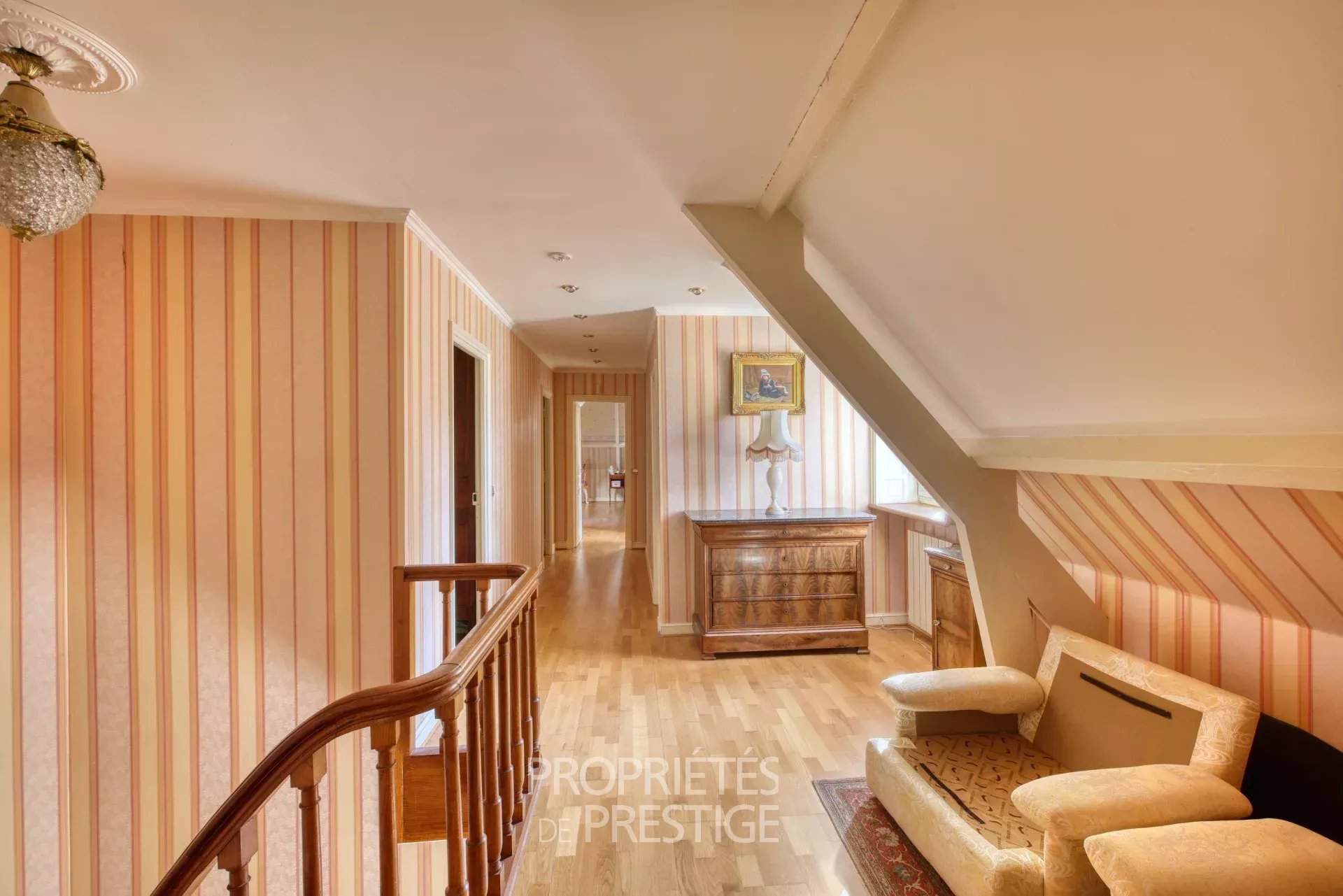 Située à 500 m du centre-village de Buc, cette propriété étendue sur un hectare en lisière de forêt domaniale de Versailles, vous offre un cadre exceptionnel pour la région. La demeure style Ile de France compte un total de 8 pièces sur 287 m² habitables (320m² utiles), dont une vaste réception de 80 m² avec une cheminée ancienne et une double exposition ouvrant sur le parc et la forêt, une cuisine indépendante, un grand bureau... A l’étage, suite parentale avec salle de bain et dressing, trois chambres, deux salles de bain… Le sous-sol est aménagé avec une salle de billard, une cave à vin, des espaces de stockage, une salle forte… Côté jardin, la maison est entourée de terrasses pour profiter de toutes les expositions. La piscine à rénover est exposée plein sud, avec vue dominante sur la vallée. Le parc s’étend jusqu’à la limite de la forêt domaniale bordée d’une enceinte en meulière. Un court de tennis à rénover est situé sur la partie supérieure du parc. Un environnement naturel unique à seulement 13 km des portes de Paris. Golf de La Boulie à proximité. Lycée Franco Allemand à 1,3 km. Possibilités de division et de constructions supplémentaires (environ 4000m² en zone UH du PLU).