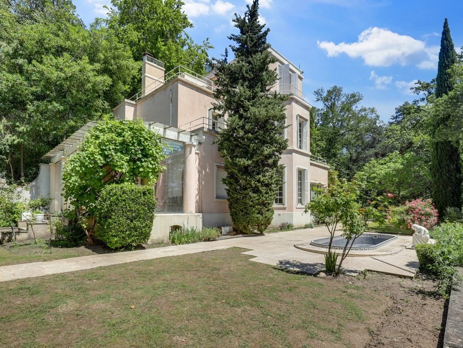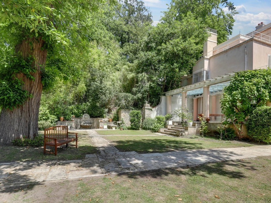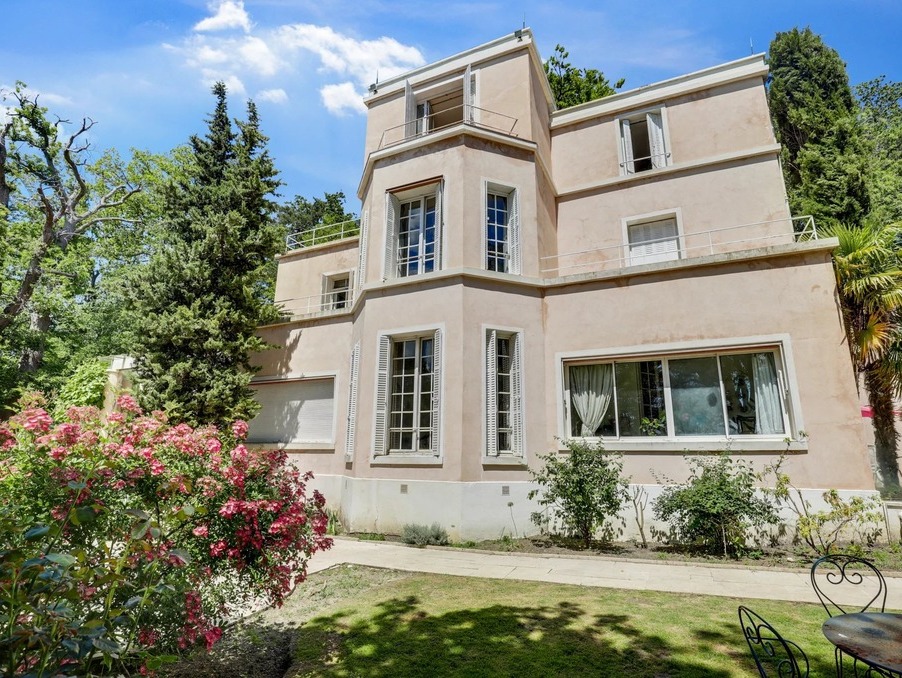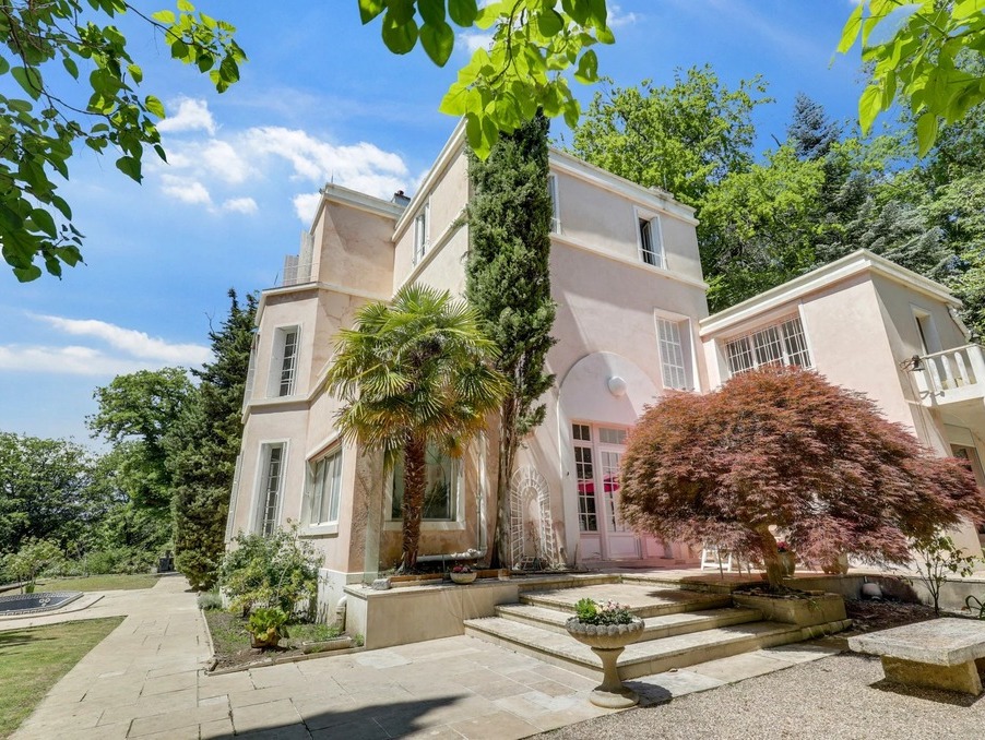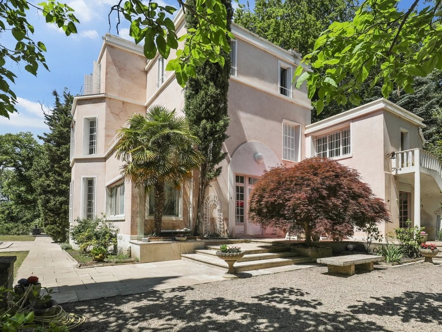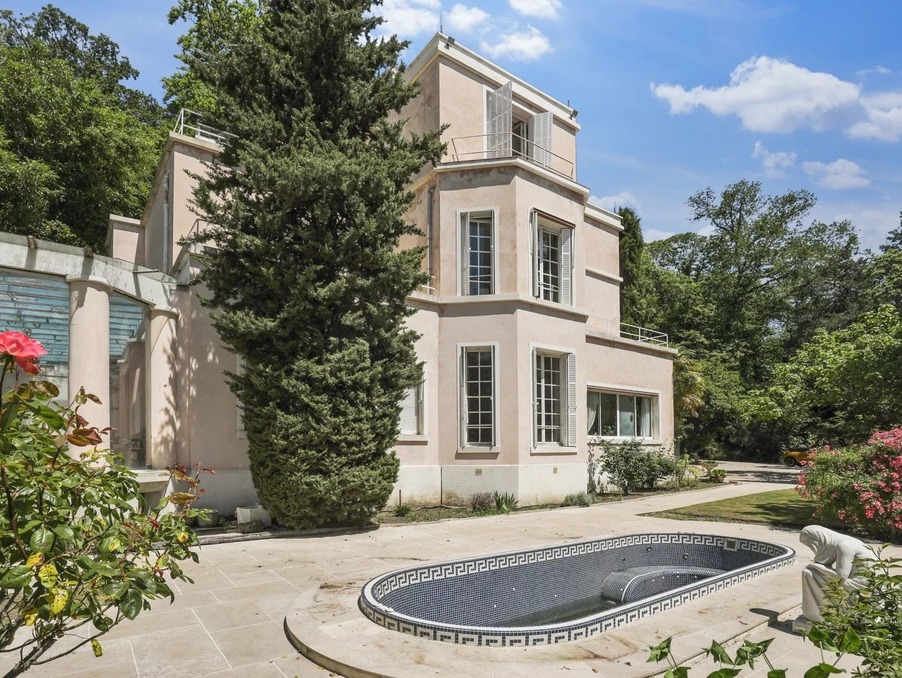 A 4 km au sud de Versailles, dans un parc boisé de près de 2 hectares à flanc de vallée, vaste villa de 439 m² habitables édifiée en 1866 puis remaniée dans un style art déco dans les années 30. Au rez-de-chaussée, un petit salon, une salle à manger art-déco avec bow-window, un grand salon de réception prolongé d'une verrière avec vue parc et vallée. Sur l'arrière de la maison, une cuisine avec espace dinatoire, une buanderie, des caves. A l'étage, une chambre ronde avec terrasse dressing et salle de bain, un grand bureau art-déco, un appartement indépendant avec séjour, kitchenette, chambre, terrasse et salle d'eau. Le second étage comprend 4 chambres, une salle de bain et une salle d'eau, une grande terrasse avec vue panoramique sur la vallée de la Bièvre. Le parc se compose de grandes terrasses et d'une piscine devant la demeure, de cheminements à flanc de coteau sur la partie boisée comprenant de très beaux arbres centenaires. La propriété comprend 2 accès, haut et bas, un garage pour plusieurs véhicules, un logement de gardien, un box à chevaux, une petit pavillon de garde... L'ensemble est situé au calme en fond d'impasse dans un secteur résidentiel, tout en étant à seulement 1 km du centre avec commerces, écoles, gare... Versailles est à 4km, accès A86 à 3 km, Paris à 16 km. Terrain en zone N, non constructible.