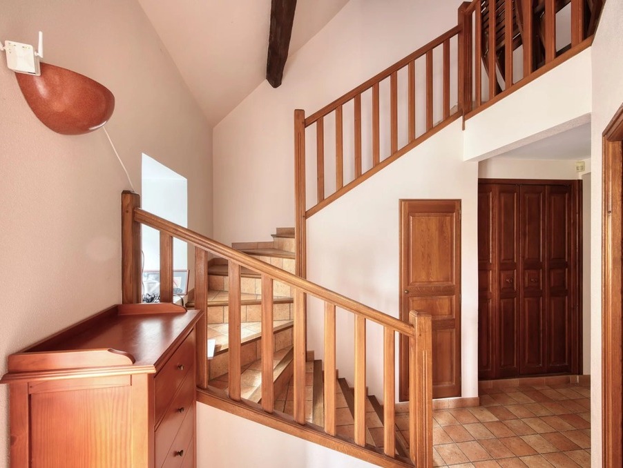 L’aile de la maison comprend, au rez-de-chaussée, une buanderie, une salle de douche avec toilettes, un atelier et un garage ; à l’étage, un palier et une salle de jeux et/ou un grand bureau. Aux étages de la bâtisse principale, un espace parental avec salle de douche, cinq belles chambres, deux salles de bain et un bureau. Les pièces des étages se caractérisent par la présence de belles poutres et structures de charpente apparentes.